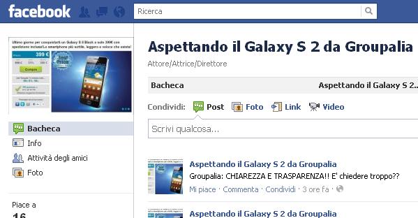 Per collegarsi alla pagina, è sufficiente accedere qui http://www.facebook.com/pages/Aspettando-il-Galaxy-S-2-da-Groupalia/242112329175695. Ricordiamo che le proposte in questione hanno fatto sì che lo smartphone Android fosse acquistabile dapprima a 499 euro, quindi addirittura a 399 euro. Lo strumento potrebbe rivelarsi utile per confrontare le proprie esperienze di acquisto.