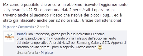 “Grazie per la tua richiesta! Ci stiamo organizzando per offrirvi quanto prima il rilascio dell’aggiornamento del sistema operativo Android 4.1.2 per Samsung Galaxy S III. Appena ci saranno novità sarete i primi a saperlo. Grazie ancora”.